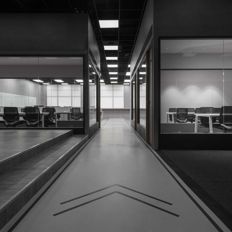 走進公司,一股奔放的能量迎面襲來。門口的LOGO牆摒棄傳統的壓克力燈箱,改以金屬洞洞板結合LED燈光,宛如一場動感與未來交織的視覺饗宴,塑造出強烈的運動工業風格。而腳下的地坪,更是別出心裁地以賽道形式呈現-一道象徵速度與挑戰的20米直線跑道貫穿入口,不只是設計巧思,更是一種無聲的召喚,提醒著每位進入這個空間的夥伴:這裡是一場賽事的起點,每一天都是突破極限的新旅程。它鼓勵著員工在工作與運動之間找到平衡,讓身體與思維時刻保持最佳狀態。